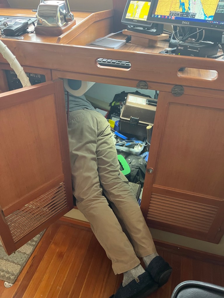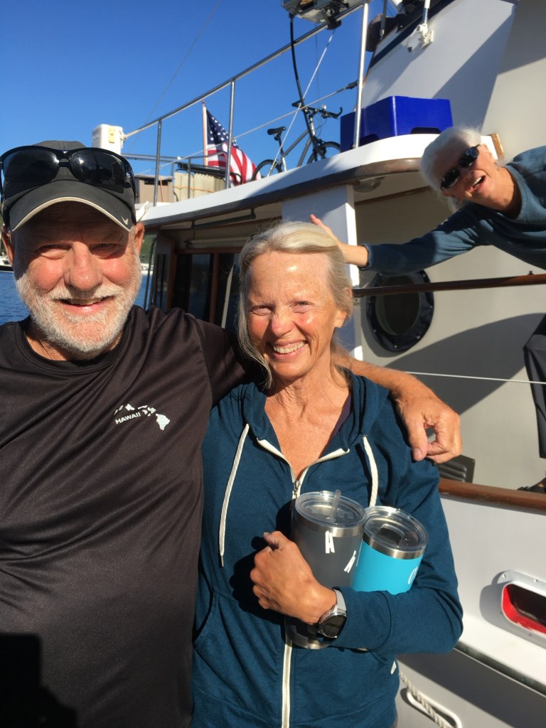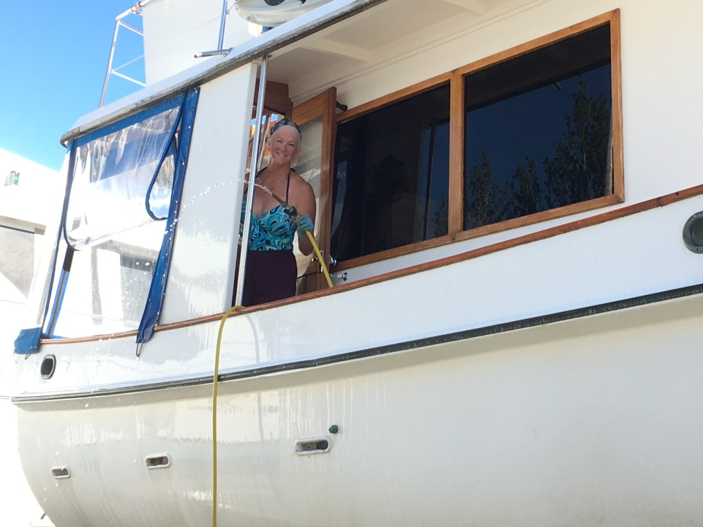 There was a good debrief on the systems aboard and Dean even had one last text message: ‘Don’t forget to bring the towed dinghy up close to the big boat, to maneuver’. The importance here was brought home when docking, and forgetting to follow his direction. I put the transmission in reverse to stop the boat and a strange clunk or thump was heard. Yep. You guessed it. The tow line was wrapped around the prop. I jumped overboard, knife in hand. Wow, that water is cold, breathtaking… After three attempts, I was worthless and very cold. Just when it was time to drop an anchor since we weren’t going anywhere fast, a couple of great guys in tenders towed us to the dock just a few yards away. These full displacement trawlers are heavy boats and once they get going, even slowly, they are hard to stop. Since everyone loves their own boat, it’s all hands-on-deck to ‘help out’ and make sure to push off a big boat if needed. After our embarrassing, ‘we’re here’ sort of arrival, I thanked everyone for their assistance. Only then did we experience just how helpful those around us can be. Offers of air tanks, masks and fins were forthcoming. I tried to dive again with air and fins, but the cold had already taken a toll. Our neighbor with the dive gear said, ‘I’ll try’. With the aid of a wetsuit, she made several dives on the prop and cleared the line! Indebted, thankful beyond words, we brought out our offers money and lots of Dean’s beer. They declined any of these. They were long distance cruisers and only hoped that they would experience the same assistance if they were in need. The only casualties were my knife I could see on the bottom beneath the boat and my pride, both of which I could do without. Rookies? Always…